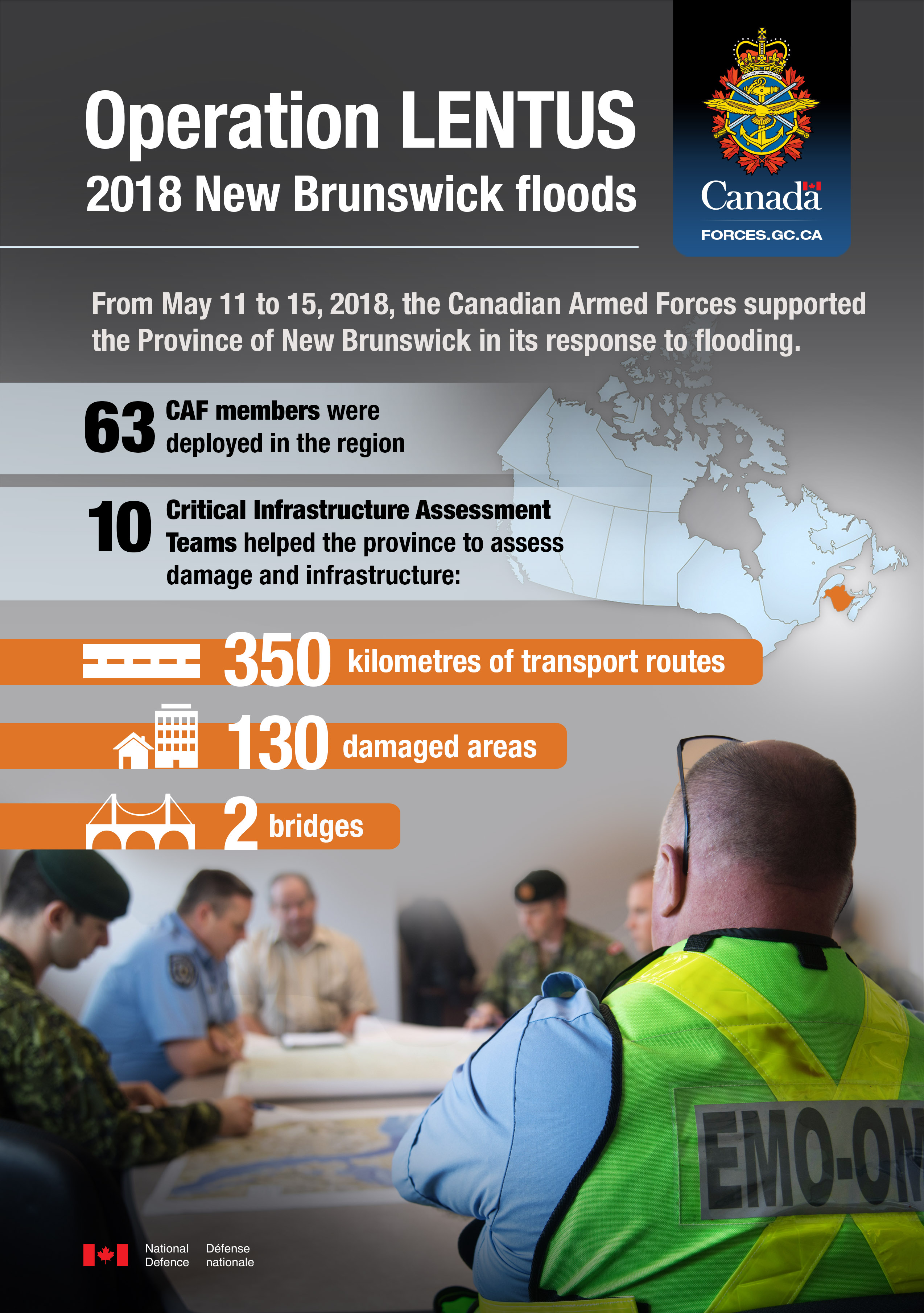 From May 11 to 15, 2018, the Canadian Armed Forces supported the Province of New Brunswick in its response to flooding<./p>