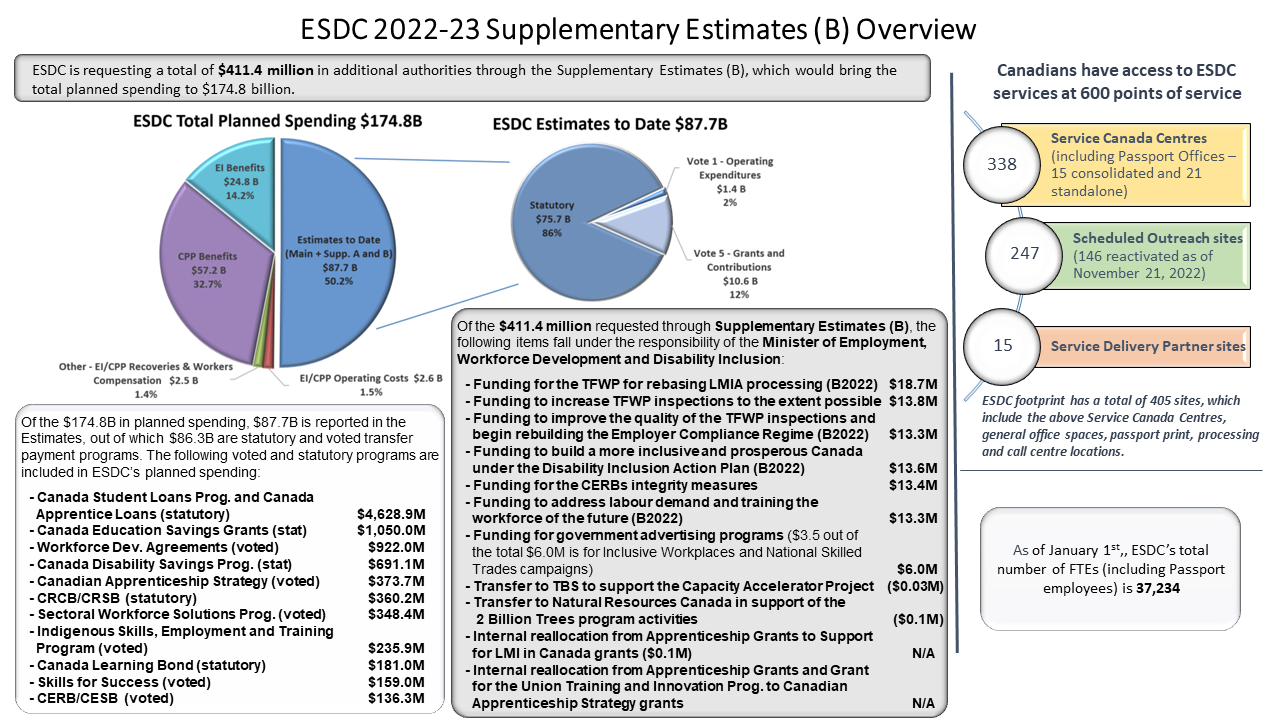 [Thank you for inviting me to discuss the Supplementary Estimates B for Employment and Social Development Canada.]