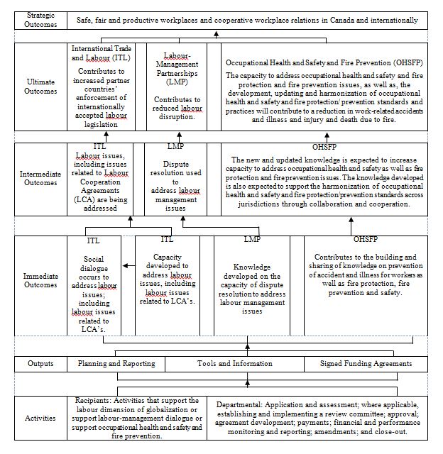 Appendix 4 presents the Labour Funding Program's logic model, which outlines the program's activities, its expected outputs, and the outcomes it intends to achieve or to which it intends to contribute. The logic model covers all three funding streams that existed at the program's launch: international trade and labour, labour management partnerships, and occupational health and safety and fire prevention.