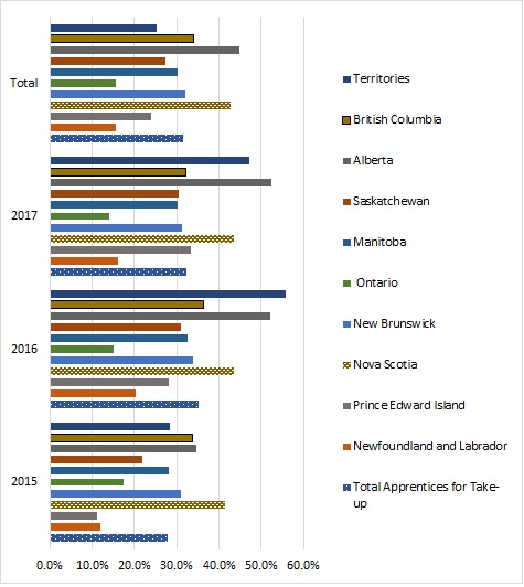 - During the period between 2015 and 2017, approximately one-third of the eligible population used the loan. The average take-up rate of the Canada Apprentice Loan over this period was 31.6% with a slightly higher rate for women (33.1%)Footnote 4