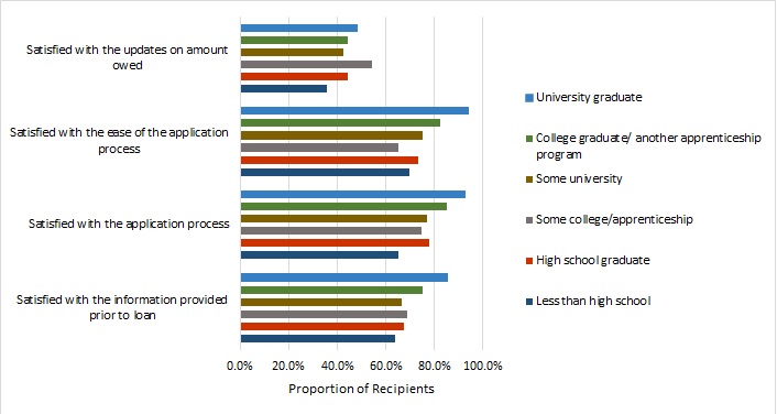 - Figure 27: Level of satisfaction of Canada Apprentice Loan recipients with service delivery by education level (N=1,111)