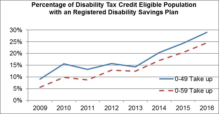 - In 2016, the take-up rate among persons aged 0 to 59 who had been approved for the Disability Tax Credit (such as, those eligible to open a plan) was 24.5%.