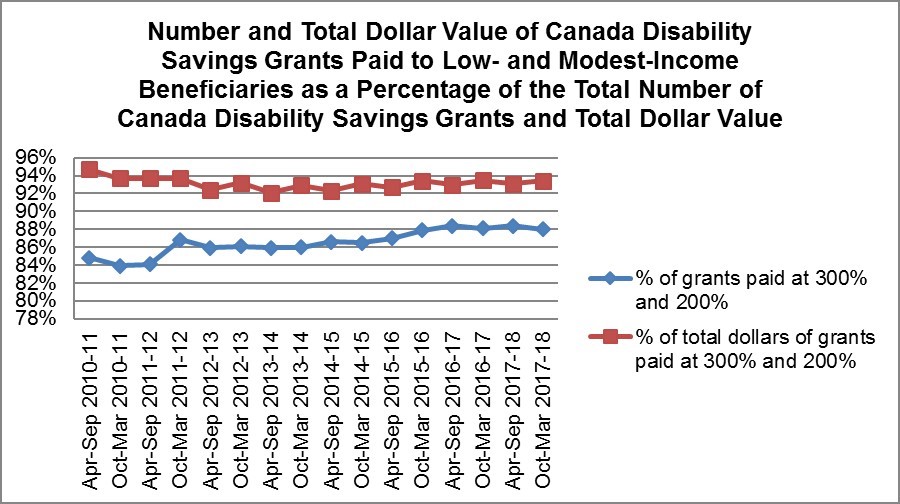 - The program has been successful in reaching its primary target of low-to modest-income people with disabilities. In fact, 94% of Canada Disability Savings Grant funds were paid to low- and modest-income beneficiaries and 90% of Canada Disability Savings Bond funds were paid to beneficiaries in low income.