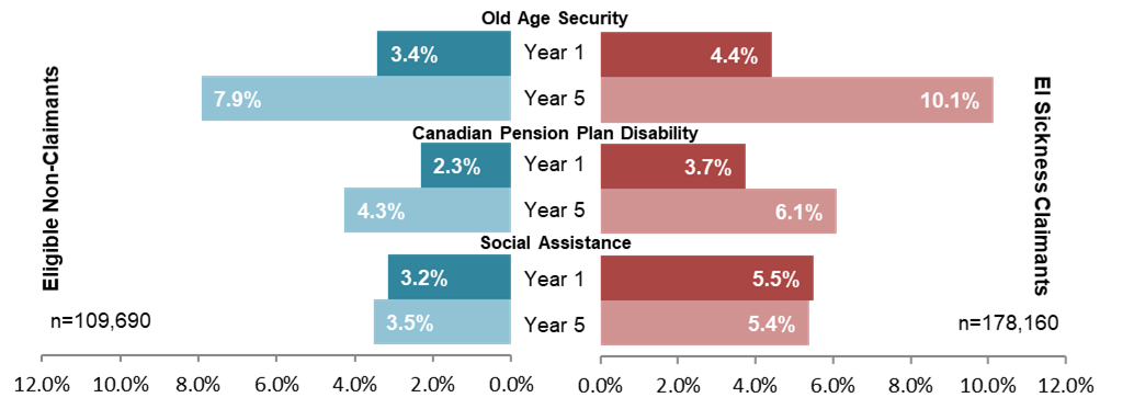 In order to assess the incremental impact of claiming sickness benefits, the comparison looked at those who received sickness benefits as the treatment group and those who were eligible or had 600 hours but did not receive the benefits as a comparison group.