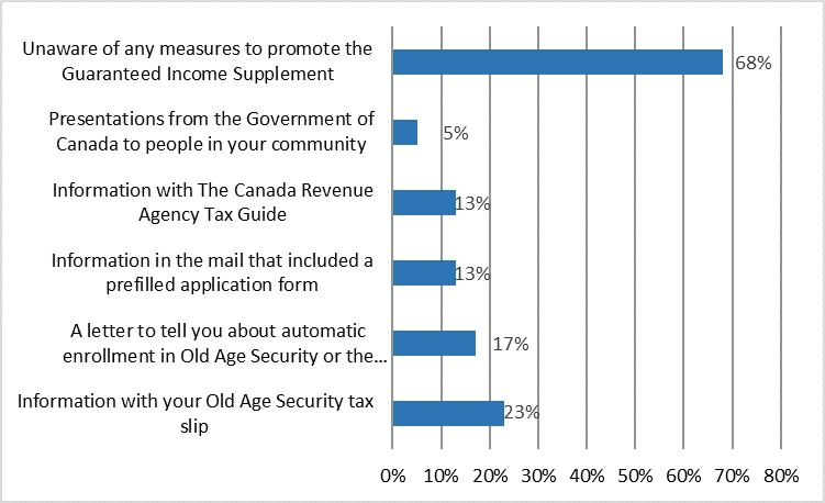 The impact of measures the Service Canada took to communicate and promote the GIS to eligible seniors was difficult to measure directly. Instead, awareness of these measures was used as a proxy measure.