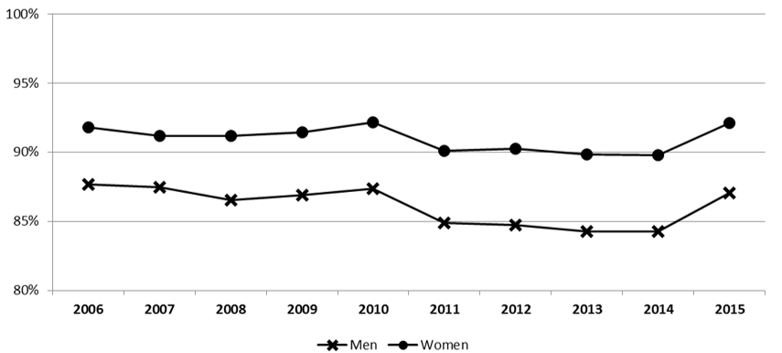 Gender: Take-up is higher among women than men. The difference in take-up between men and women has been steady at around 5 percentage points. For women, take-up varied through the period of observation (particularly between 2010 and 2015) but remained at 92% for both 2006 and 2015.Footnote 23 Take-up for men was 88% in 2006 and 87% in 2015. See graph in Annex D.