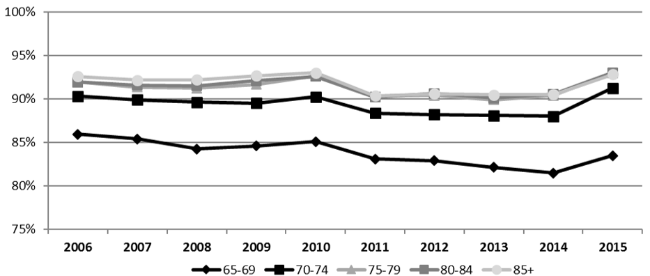 Age: The Longitudinal Administrative Databank used different age categories but the trends were similar to those from the Old Age Security Administrative Data. Rates were lowest for those 65 and 66 (75% and 71% in 2006 and 2015, respectively) and there was there was stability among the older age groups with a slight uptick from 2014 to 2015 (85% to 90%, 89% to 93%, and 91% to 94% for those aged 67 to 74, 75 to 84, and 85 plus, respectively).Footnote 132