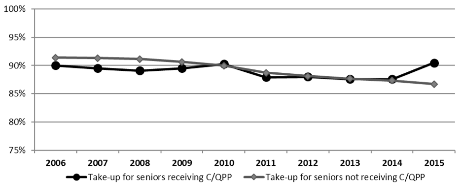 Age: There was a lower take-up rate among people aged 65 to 69 years in 2006 (85% and 90%, respectively) compared to older cohorts (90%, 91%, and 92% for those aged 75 to 79, 80 to 84 and 85+, respectively). From 2006 to 2014, there was a slight decrease in take-up among all age groups, with an increase in 2015. It was most apparent among individuals between 65 and 69, where take-up declined by about 2 percentage points during the period.Footnote 24 See graph in Annex D.