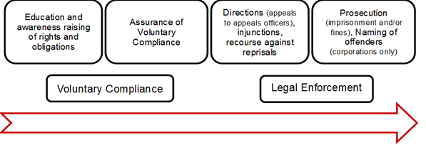 - To what extent does the use of different mechanisms of enforcement (issuance of Assurance of voluntary compliance, Directions Investigation of complaints, filling orders or Prosecution in federal court) help to correct and/or prevent a breach of the Canada Labour Code, Part II?