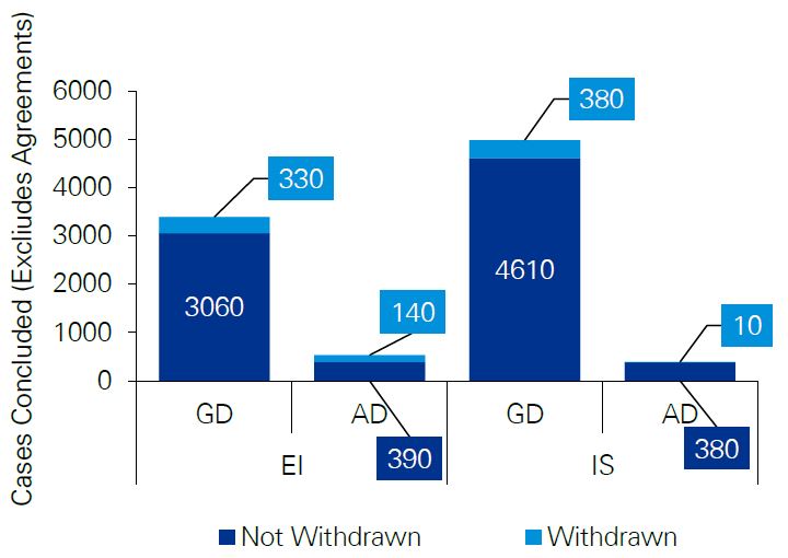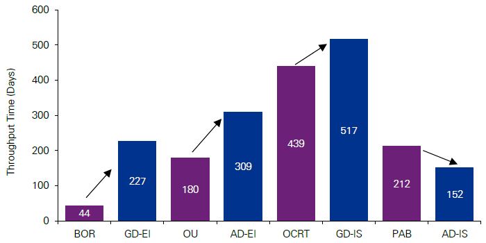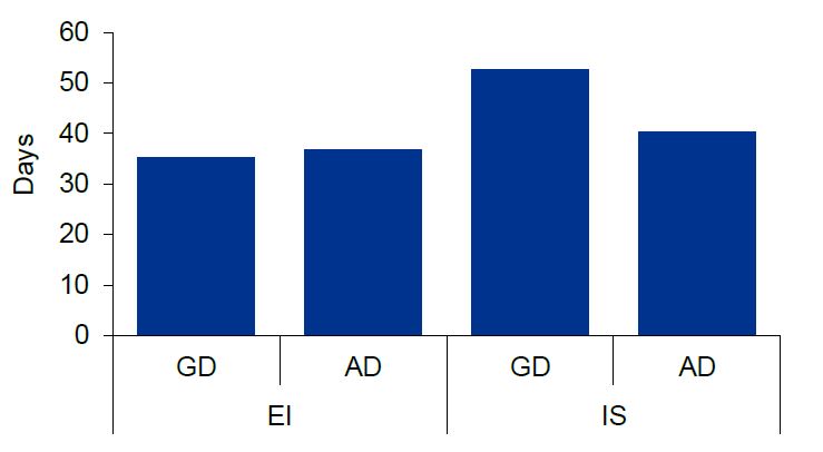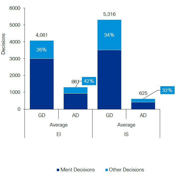 - Timelines from application to decision are longer under the General Division for both EI and IS, and the Appeal Division for EI than under the legacy tribunals. This extended timeline is particularly acute for EI appeals to the General Division which take on average over five times longer than the former Board of Referees.
