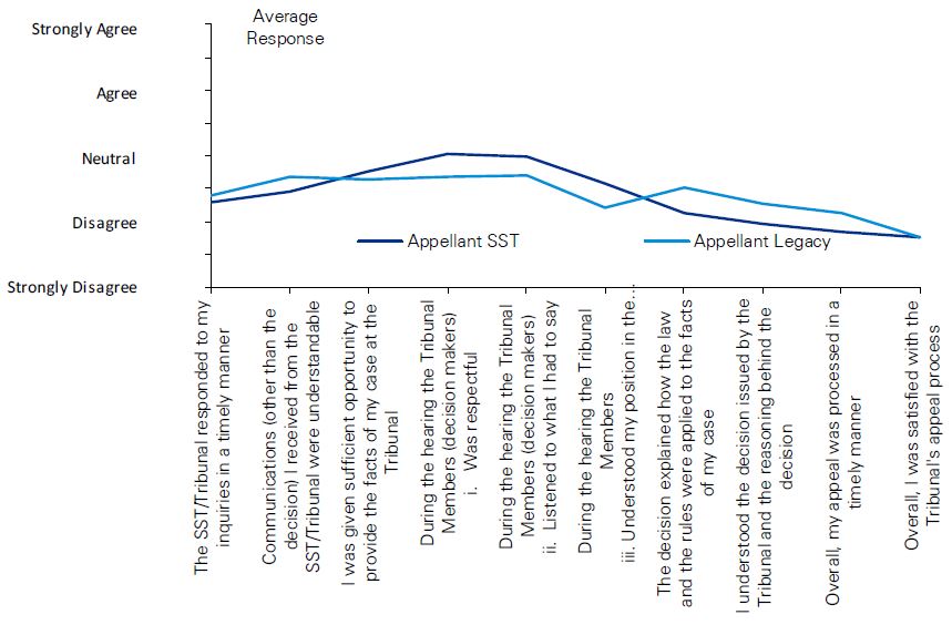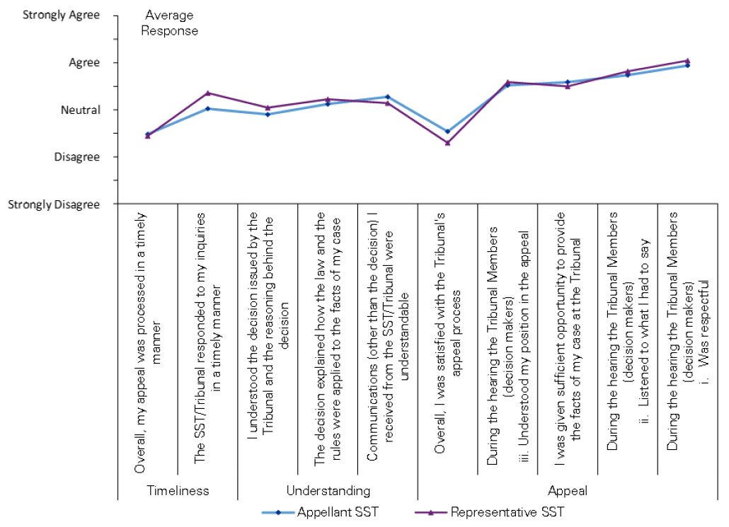 While the SST’s legislative and regulatory framework that underpins its processes and operations has significant differences from the previous tribunals, the “raison d’être” remains the same: to secure the just, most expeditious and least expensive determination of appeals and applications, and to conduct proceedings as informally and quickly as the circumstances and the considerations of fairness and natural justice permit. There are two levels of appeal for each program, as before. The basis of appeal – eligibility against established criteria – remains. The governing principles of providing a fair, credible and accessible appeals process are unwavering. Economies of scale have been achieved by consolidating administrative functions of four tribunals to one. According to survey responses and reference documents, client satisfaction with the SST is not high but not necessarily lower than under the previous system. Still, legitimate complaints and strong evidence of added complexity, lengthier timelines, and a more formal, distant, legalistic tribunal that is difficult for the lay person to navigate, has many longing for the past and calling for change.