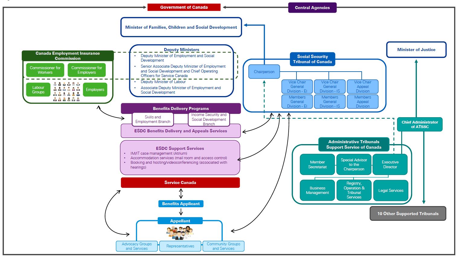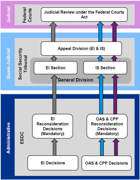 Reporting to the Minister of Employment and Social Development Canada (ESDC), the SST was created on April 1, 2013 to review appeals of decisions from the Canada Employment Insurance Commission (CEIC or Commission) relating to the Employment Insurance (EI) program, and decisions from ESDC pertaining to the Canada Pension Plan (CPP) and Old Age Security (OAS) programs. This new administrative tribunal combined under one structure four administrative tribunalsFootnote 1 that made quasi-judicial decisions on appeals for the aforementioned programs. These former legacy tribunals operated under the umbrella of the former Human Resources and Social Development Canada (HRSDC) and CEIC.