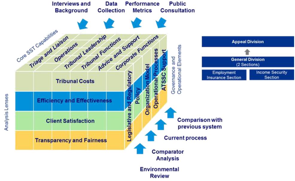 The review and resulting analysis considered the complexity of the system, along with a number of other areas of focus including analysis of costs and timelines, the appeals structure, the complexity of the processes, the relationships between government organizations, the accountability of the SST and engagement with stakeholders, and the client-centricity of the appeals processes and system.