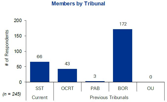 In total 245 members responded to the survey. The following chart shows that 172 (or 70%) respondents indicated they were appointed to the Board of Referees, 66 (or 27%) are/were members of the SST, 43 (or 18%) were members of the OCRT, and three (or 1%) were members of the PAB. Responses were not solicited from members of the Office of Umpire as contact information was unavailable. Note that 207 respondents indicated they were/are a member of one tribunal, 37 indicated two tribunals, and one respondent indicated three tribunals.