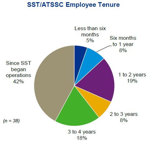 All but one of the SST/ATSSC employees who participated in the survey indicated they are still employed with the SST/ATSSC. Also, 42% of the employees indicated that they have been employed since the SST began operations indicative of stability of tenure (as shown below).