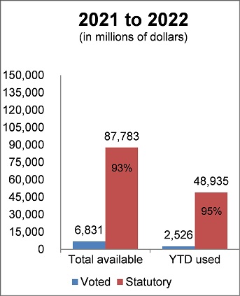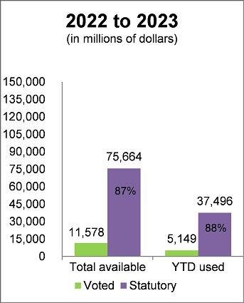 ESDC’s total budgetary authority available in the second quarter ending September 30, 2022 was $87,242 million, which represents an overall decrease of $7,372 million from the previous year. Much of this decrease relates to COVID-19 statutory measures provided under the Canada Recovery Benefits Act in the second quarter of the fiscal year ending March 31, 2022. Total Year-to-Date (YTD) budgetary authorities used as of the second quarter ending September 30, 2022 were $42,645 million. In comparison, total YTD budgetary authorities used as of the second quarter of the previous year were $51,461 million, representing a year-over-year decrease of $8,816 million.