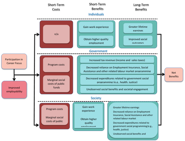 Figure 4 presents a conceptual framework for how costs and short and long-term benefits might accrue from participation in the Career Focus program for individual, government, and society.