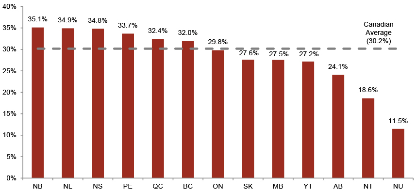 Figure 1: Share of older individuals (55 and over) in total population, by province, Canada, 2016