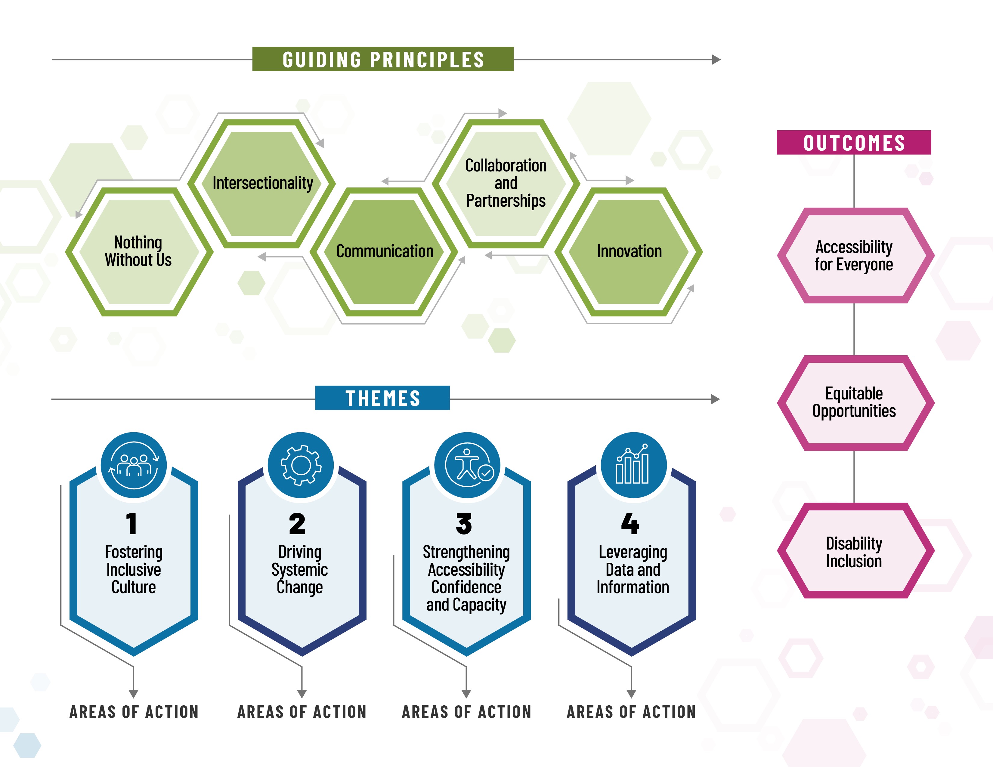 The five guiding principles are listed as: nothing without us, intersectionality, communication, collaboration and partnerships, and innovation. The four themes are listed as: fostering inclusive culture, driving systemic change, strengthening accessibility confidence and capacity, and leveraging data and information. The three outcomes are listed as: accessibility for everyone, equitable opportunities, and disability inclusion.