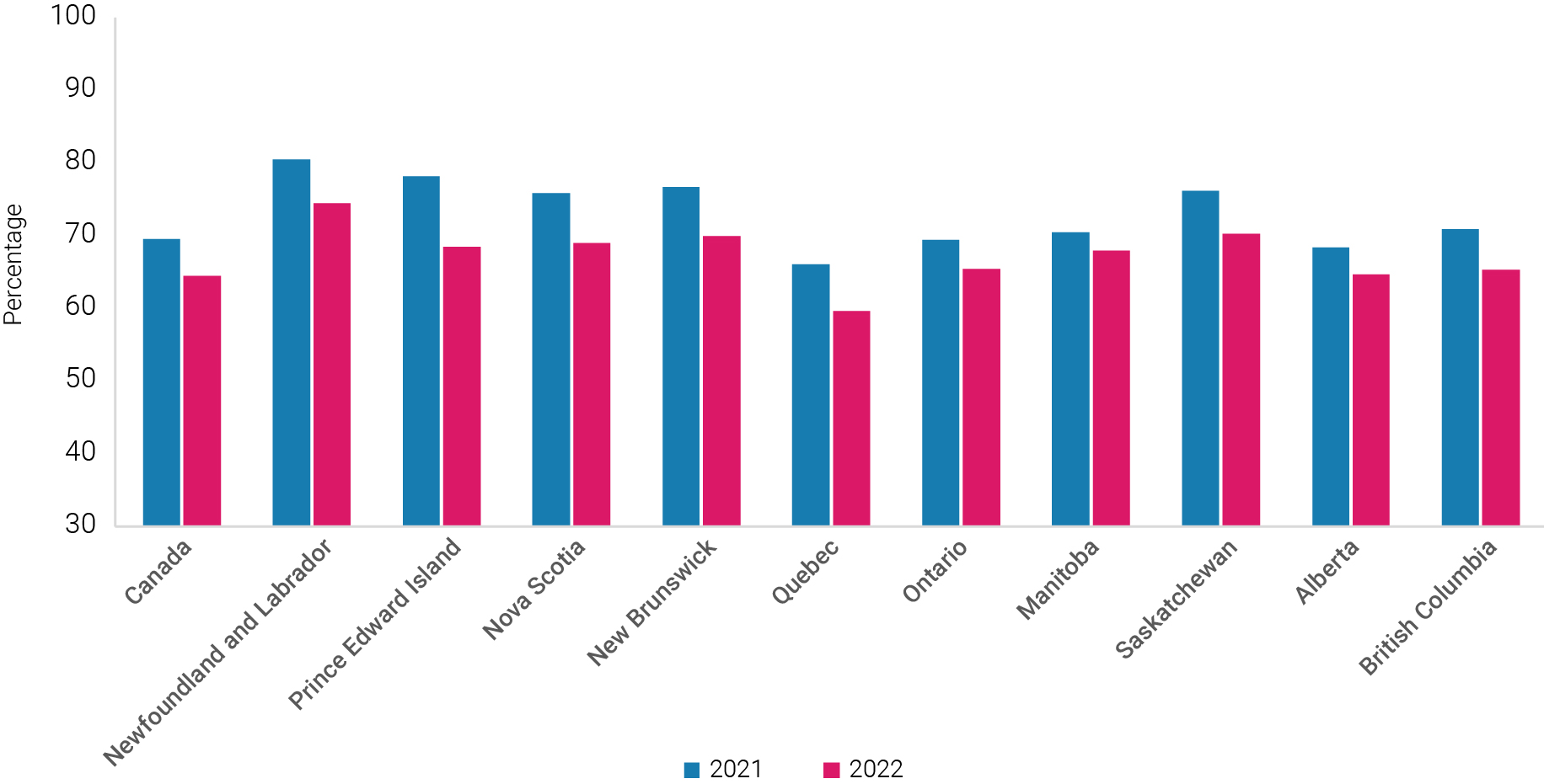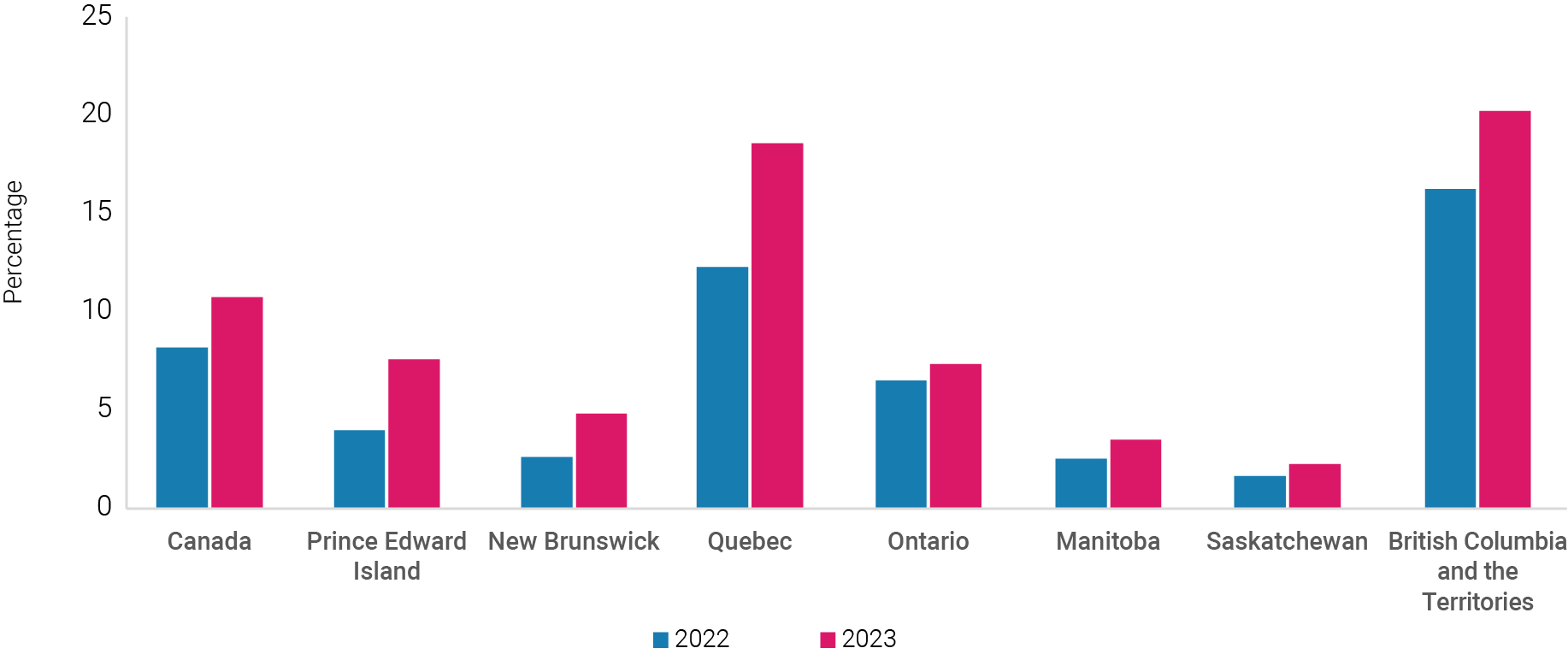 Similarly, food insecurity is experienced differently across Canada, and is affected by several intersecting factors, such as where people live, income, discrimination, education, Indigeneity, age, disability, and family structure. According to estimates from the 2021 Canadian Income Survey (CIS), 18% of families (6.9 million) reported experiencing some level of food insecurity, up from 16% in the previous year.Footnote 4 Food insecurity rates remain higher in the territoriesFootnote 5, and for Indigenous Peoples living in isolated northern communities.Footnote 6