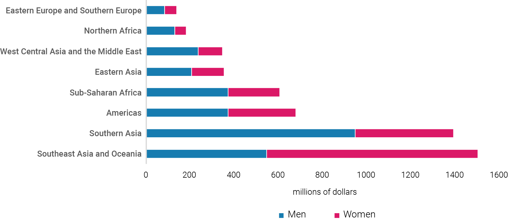 Figure 33: Personal remittances sent to relatives or friends living outside Canada in 2017, by sex and birth region, Canada, in millions of dollars