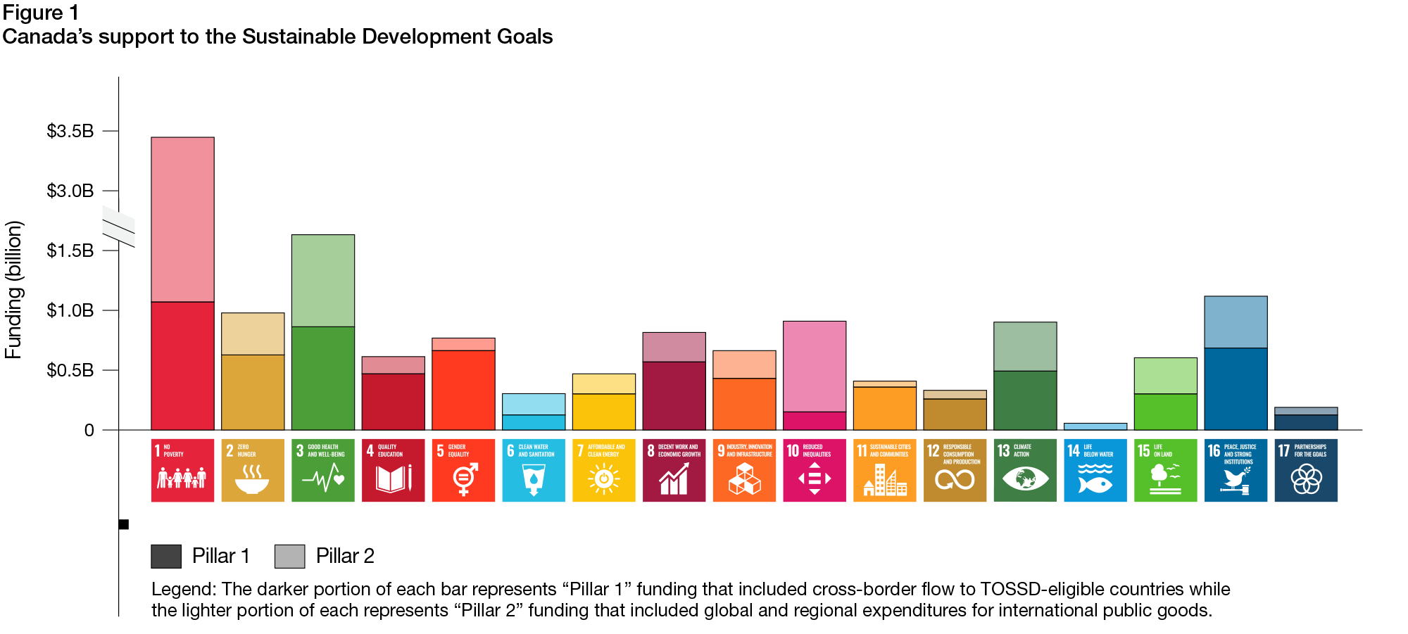 Through its Total Official Support for Sustainable Development (TOSSD) Footnote 5 Canada supports sustainable development in developing countries. From years 2018 to 2021, Canada mobilized $33.5 billion in TOSSD and, as a result of blended finance initiatives, mobilized a further $635 million in private investments. Below is a breakdown of how much funding was mobilized for each SDG.