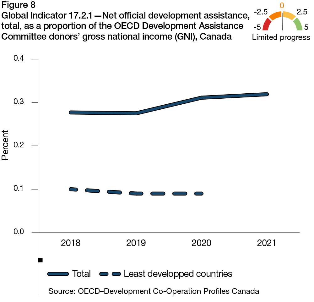 The CIF was launched in 2019 and refined in 2021. It established 31 Canadian ambitions and 76 indicators to monitor and measure Canada's progress toward achieving the 17 SDGs. Canadian data is available to the public, through two interactive data hubs: the CIF and the Global Indicator Framework data hub. These hubs provide disaggregated data that offers a more complete picture of disparities experienced by populations that are marginalized and/or living in vulnerable situations, which can help to inform efforts aimed at ensuring that no one is being left behind. To enhance Canada's reporting on the CIF, Statistics Canada launched a new "measure of progress" on its data hub, in 2023.Footnote 3 It presents a simplified illustration of Canada's progress toward achieving each of the SDGs, based on the assumption that the current trends will continue. The VNR and its Statistical Annex (Annex B) feature measures of progress for selected SDG indicators and targets.