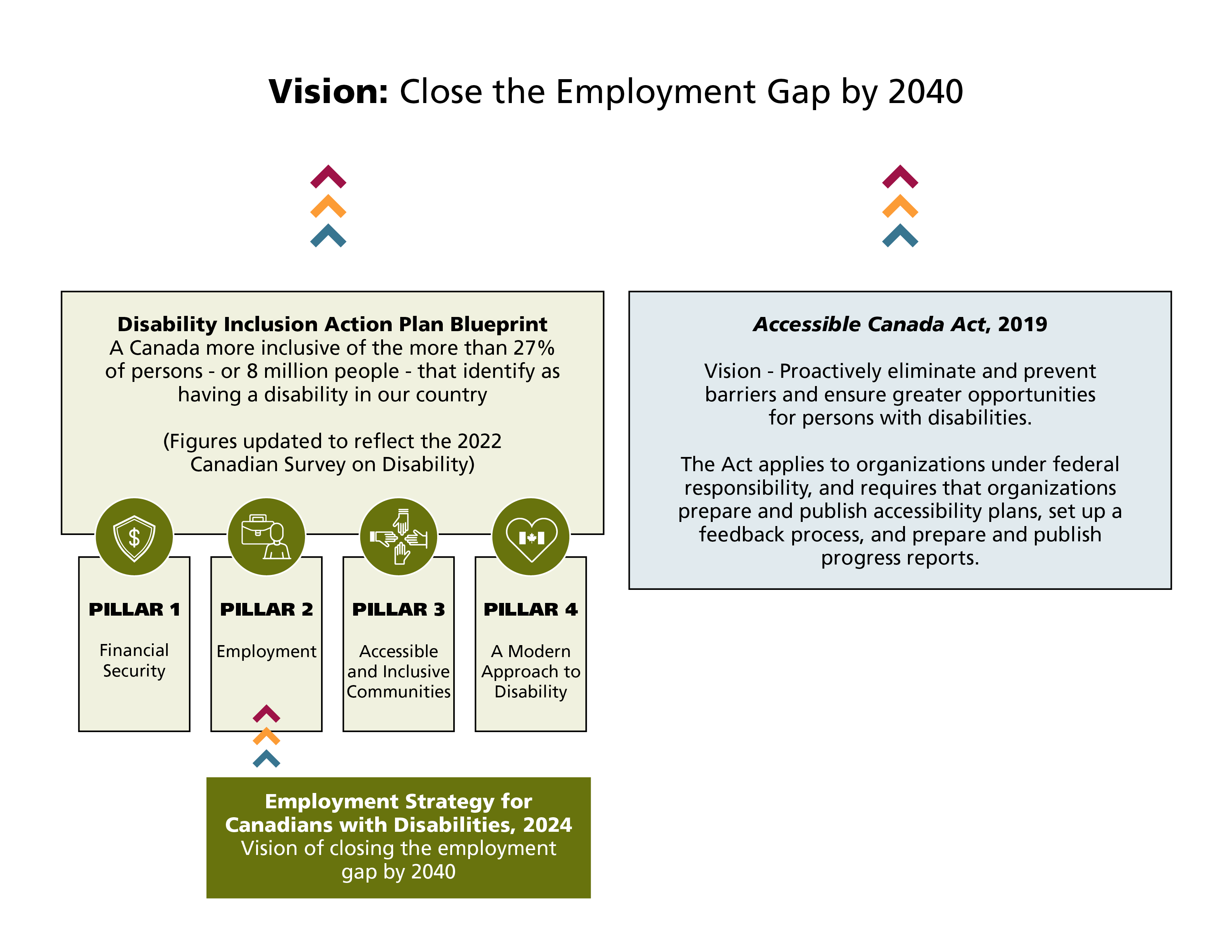 Lastly, this infographic has a final textbox below the employment pillar textbox. The title is "Employment Strategy for Canadians with Disabilities, 2024" and has the text: Vision of closing the employment gap by 2040.