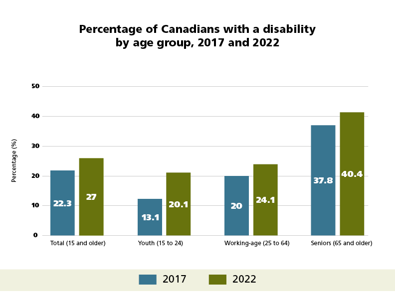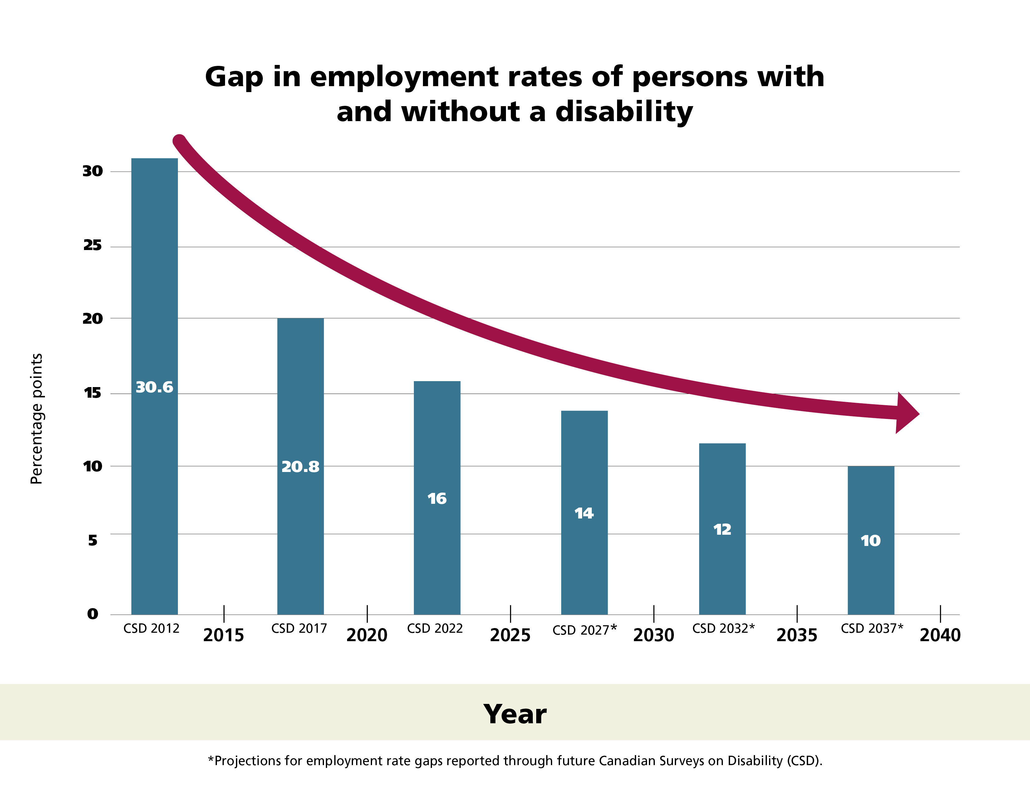 ESDC has set a goal to reduce this gap by 2% by the next Canadian Survey on Disability in 2027. If we keep making similar progress every 5 years, the gap between the employment outcomes of persons with disabilities who can work, called "labour force availability," should be eliminated by 2040. This is one way of measuring progress. Progress measures will be refined in the coming years and additional measures will be added. Work is continuing to strengthen and support data measures and reporting on progress.