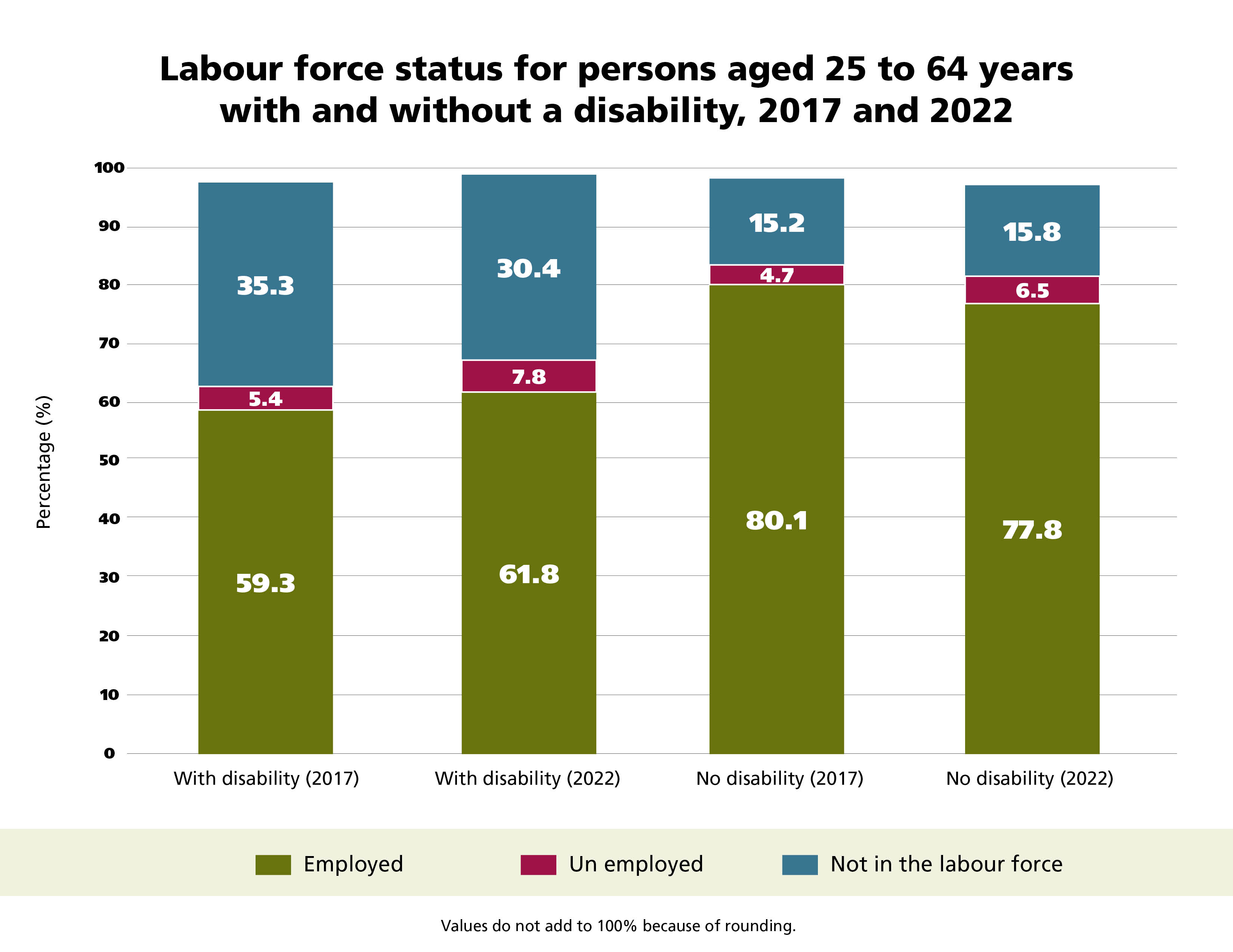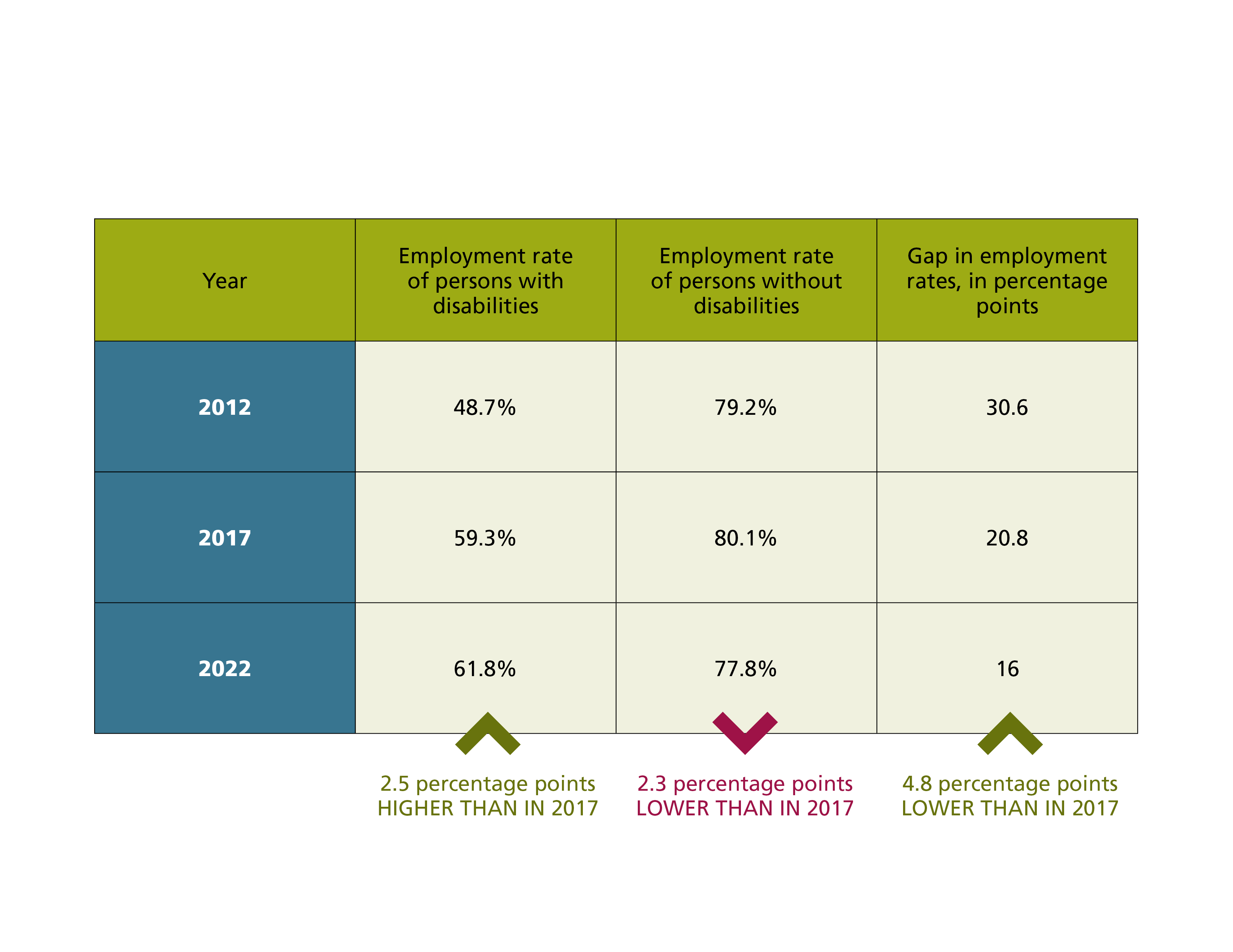 | Year | Employment rate of persons with disabilities | Employment rate of persons without disabilities | Gap in employment rates, in percentage points |