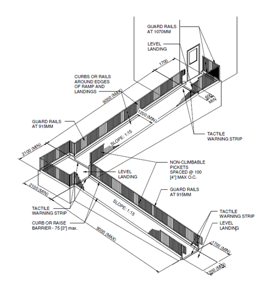 - The ramp starts at a level doorway and goes down a first slope until it reaches a landing. It has a 90 degree turn to go down a second slope and ends at a level landing