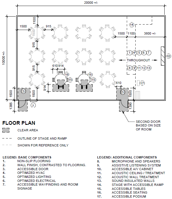 Accessible multi-purpose rooms can vary in size between 25 sq m and 200 sq m. The diagram above shows an example configuration for the largest room size available under flat rate costs (200 sq m). It is important to consult certified professionals, such as architects and mechanical/electrical engineers, to optimise the soundproofing systems within the space. Professional fees are included in the flat rate cost.