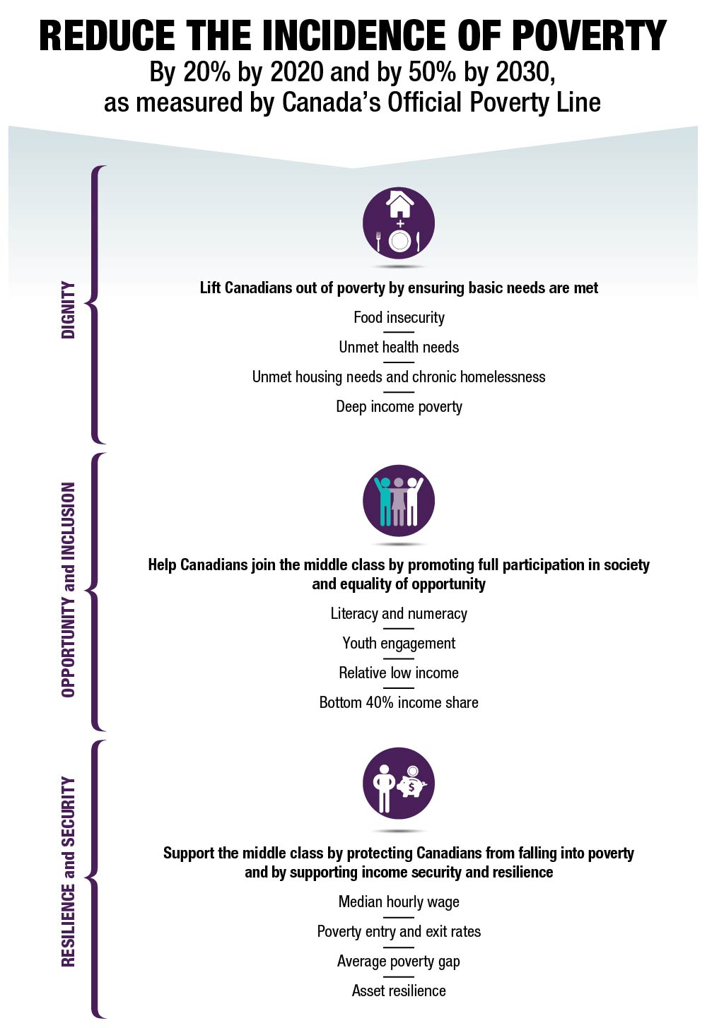- Dignity: Lifting Canadians out of poverty by ensuring basic needs—such as safe and affordable housing, healthy food, and health care are met;