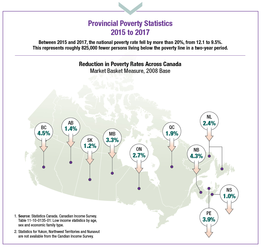 Between 2015 and 2017, the national poverty rate fell by more than 20%, from 12.1% to 9.5%. This represents roughly 825,000 fewer persons living below the poverty line in a two-year period. British Columbia and New Brunswick had the largest reductions in poverty (4.5% and 4.3% respectively) from over 14% in 2015 to 10% in 2017.Poverty rates across vulnerable groups