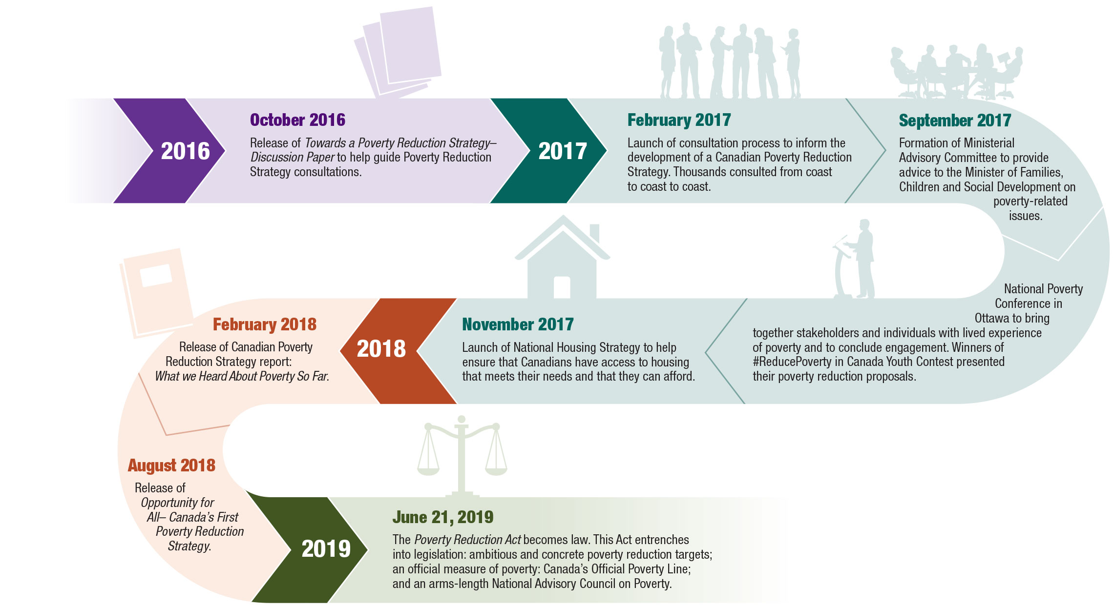 - June 21, 2019: The Poverty Reduction Act becomes law. This Act entrenches into legislation: ambitious and concrete poverty reduction targets; an official measure of poverty: Canada’s Official Poverty Line; and an arm’s length National Advisory Council on Poverty.
