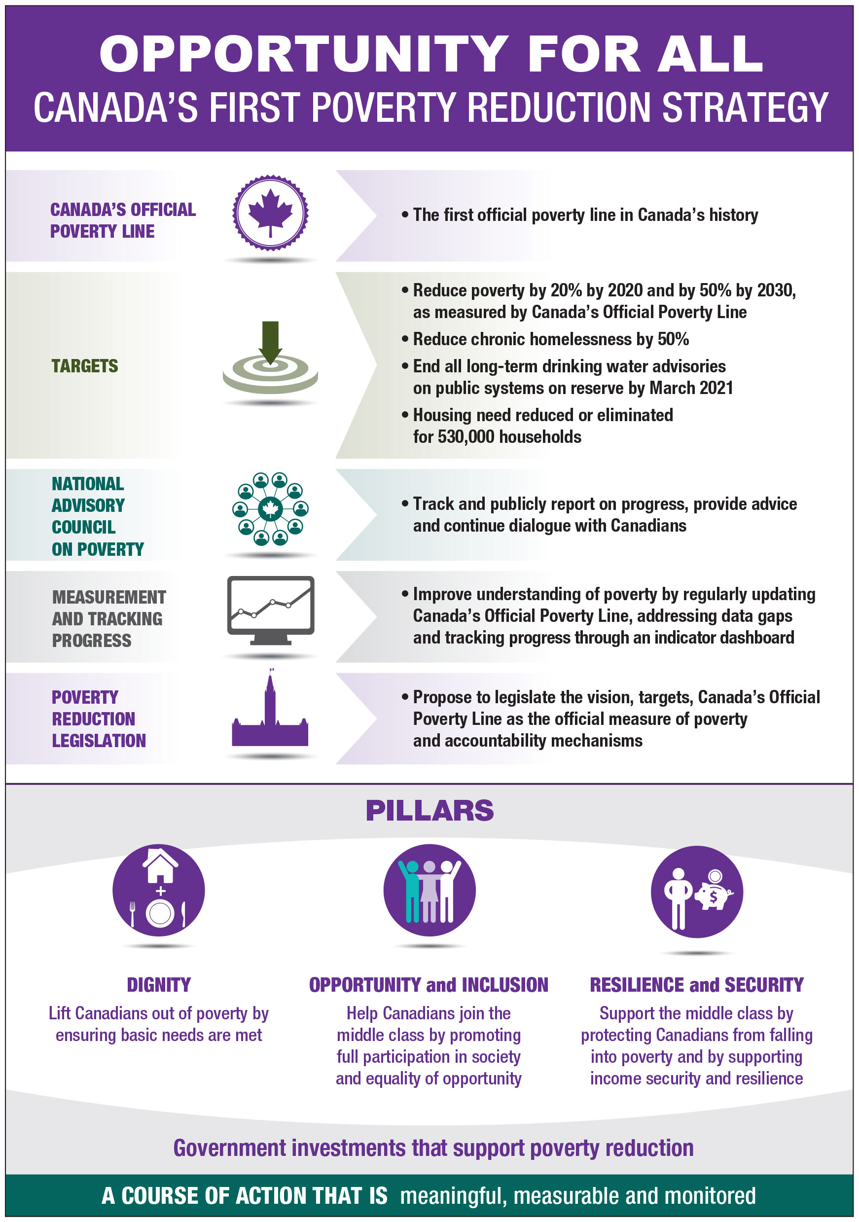 Opportunity for All includes long-term commitments to guide the Government of Canada’s actions and investments including: establishing Canada’s first-ever Official Poverty Line; concrete poverty reduction targets; a data and measurement plan to address data gaps and track progress on poverty; the establishment of the National Advisory Council on Poverty; and poverty reduction legislation.