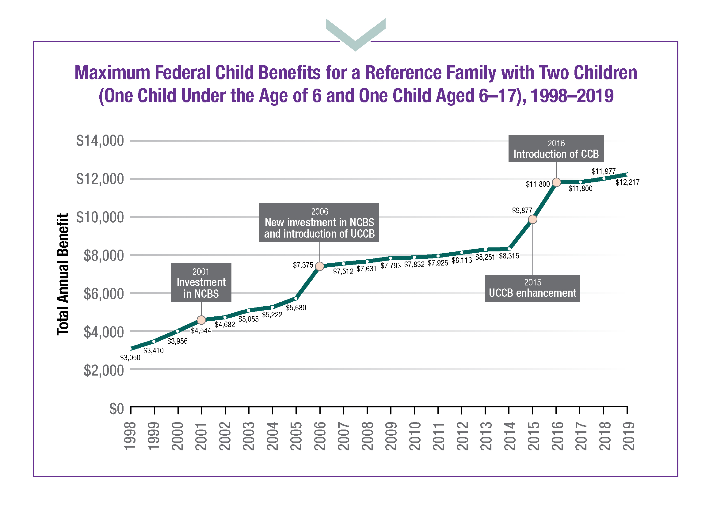 Maximum Federal Child Benefits for a Reference Family with Two Children - Text description