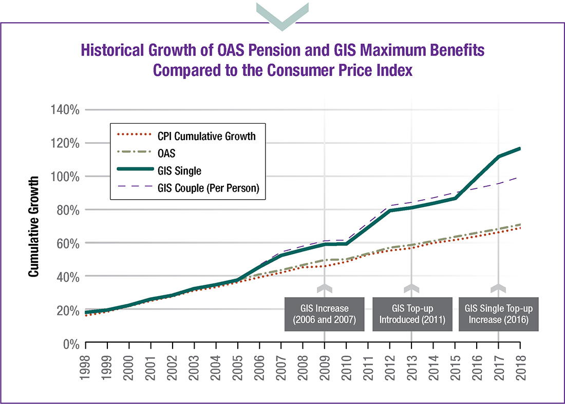 As shown in the Historical growth of OAS pension and GIS maximum benefits compared to Consumer Price Index table, lump-sum increases to the GIS over the years have resulted in benefits increasing above the estimated increase to the cost of living. In addition, annual indexation of OAS and GIS program benefits ensures that benefit amounts keep pace with the cost of living.