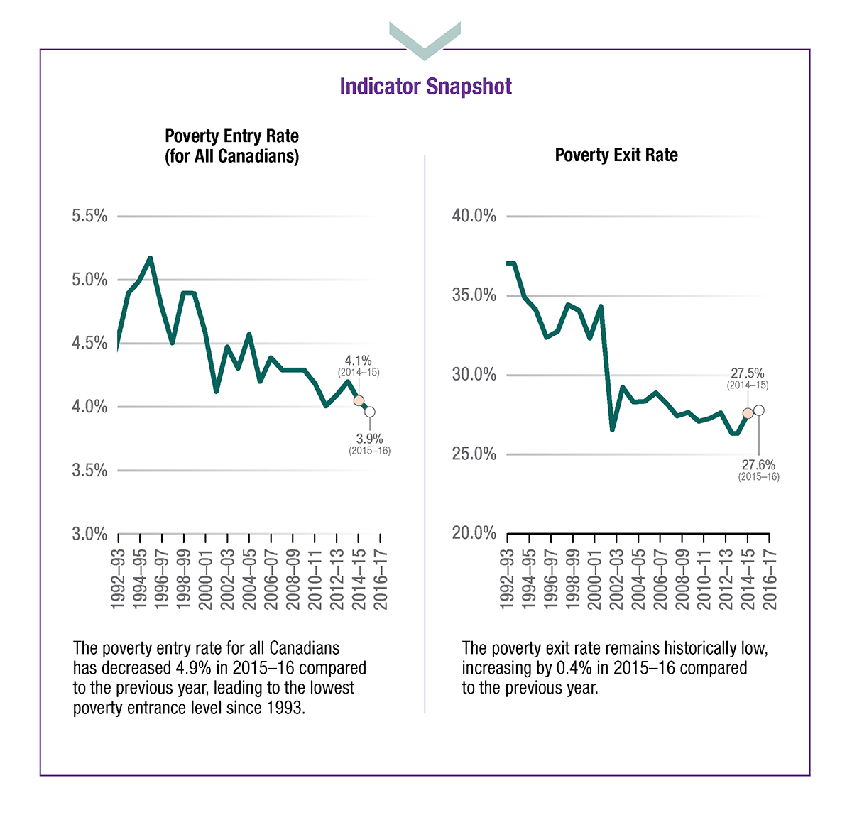 The poverty entry rate for all Canadians has decreased 4.9% in 2015-16 compared to the previous year, leading to the lowest poverty entrance level since 1993.