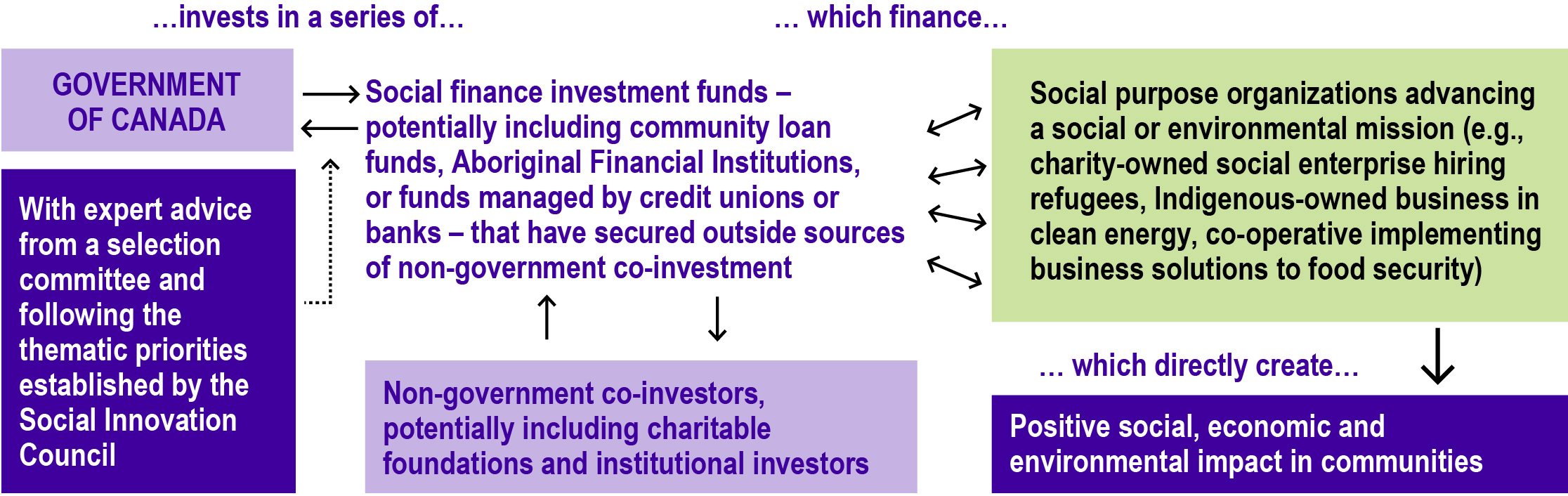 - Funding and capital opportunities so that social purpose organizations have the financial resources to develop, test, adopt, and grow innovative solutions to social and environmental problems;