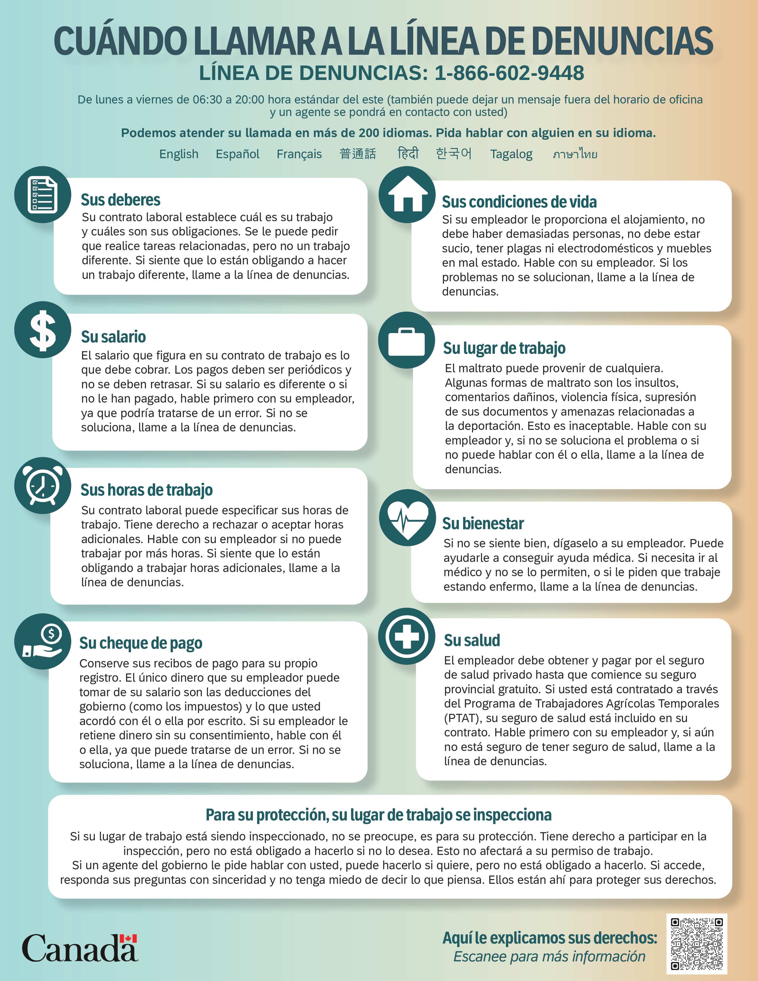 El empleador debe obtener y pagar por el seguro de salud privado hasta que comience su seguro provincial gratuito. Si usted está contratado a través del Programa de Trabajadores Agrícolas Temporales (PTAT), su seguro de salud está incluido en su contrato. Hable primero con su empleador y, si aún no está seguro de tener seguro de salud, llame a la línea de denuncias.
