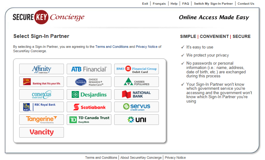 If signing in through the Sign-in Partner method, you may use a username and password that you already have with one of the financial institutions on the Government of Canada’s list of Sign-in Partners. Follow the steps below to sign in using a Sign-in Partner:
