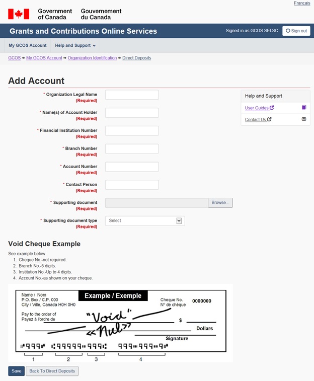 - a void cheque or a direct deposit document from your financial institution is required in the supporting document field