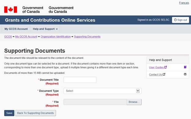The Supporting Documents screen in the Organization Identification menu allows for uploading and storing of files that may be used to support an application for funding but don’t vary based on the project (for example, patent letters, bylaws, etc.).