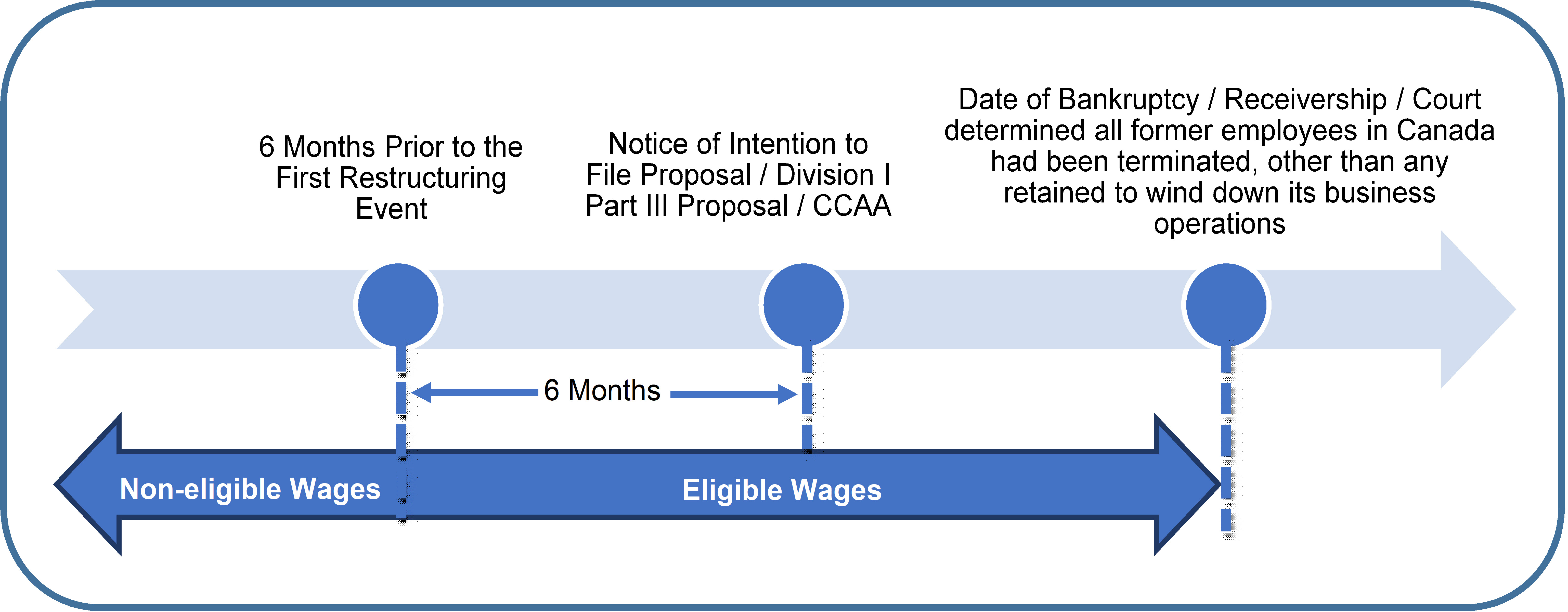 - ending on the date of the bankruptcy, receivership, or date the court determined that all former employees in Canada had been terminated, other than any retained to wind down its business operations
