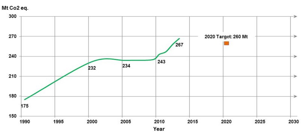 Figure 1 presents a single time series line graph with the horizontal axis spanning the years 1990 to 2030 in five year increments. The vertical axis is Mt CO2 eq and spans the value of 150 to 300 in increments of 30. The starting value in 1990 is 175 Mt which increases to 232 Mt in 2000 before plateauing at 234 Mt in 2005, increasing to 243 Mt in 2010, and to 287 Mt in 2013. The provincial 2020 target of 260 Mt is noted.