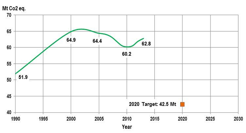 Figure 1 presents a single time series line graph with the horizontal axis spanning the years 1990 to 2030 in five year increments. The vertical axis is Mt CO2 eq and spans the value of 40 to 70 in increments of 5. The starting value in 1990 is 51.9 Mt, increasing to 64.9 Mt in 2000 before declining to 64.4 Mt in 2005 and 60.2 Mt in 2010, increasing to 62.8 Mt in 2013. The provincial 2020 target of 42.5 Mt is noted.