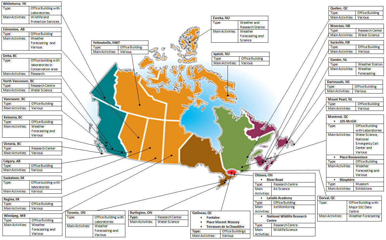 A map of Canada includes labels identifying Environment Canada’s office locations, types and main activities across Canada. These offices are: