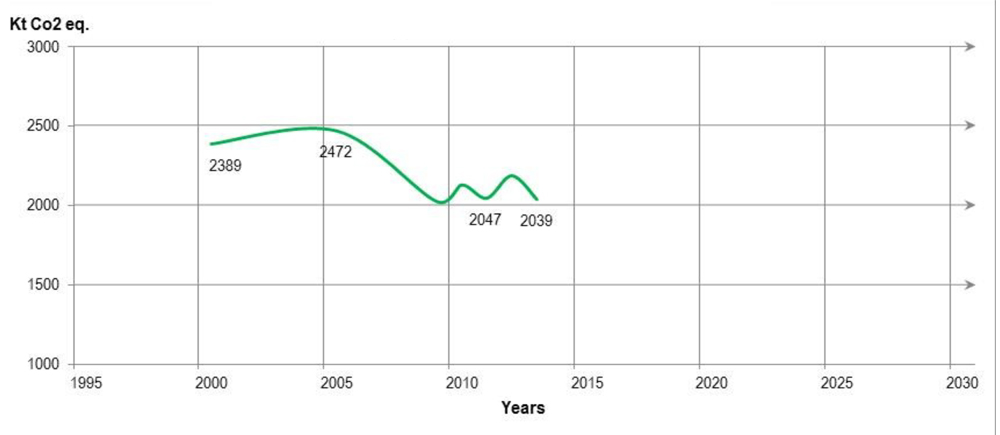 Figure 1 is representative of all three territories’ (Nunavut, Yukon and Northwest Territories) collective GHG emissions. It presents a single time series line graph with the horizontal axis spanning the years 1995 to 2030 in five year increments. The vertical axis is Kt CO2 eq and spans the value of 1000 to 3000 in increments of 500. The starting value in 2001 is 2389 Kt, increasing to 2472 Kt in 2005. It declines to 2047 Kt in 2011 and 2039 Kt in 2013. The territorial 2020 and 2030 targets are not noted.