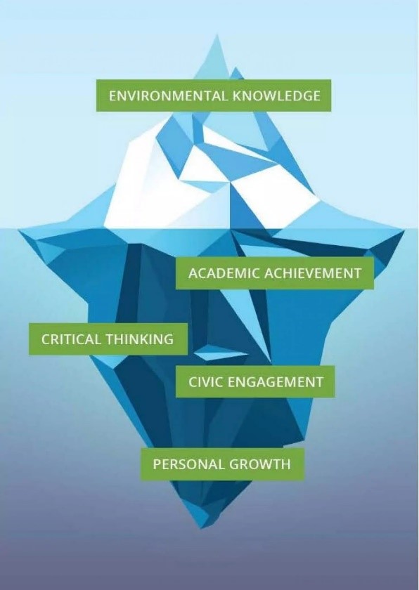 An iceberg with one-third seen above water and two-thirds underwater is labelled with 5 aspects of environmental learning. This illustrates that there are multiple elements to environmental learning, of which some are more visible than others but are all important to achieving environmental literacy. The tip of the iceberg, which is the smallest and only portion seen above water, is labelled “Environmental Knowledge”. The lower and larger portion of the iceberg, beneath the water shows 4 other elements of environmental learning. From the surface break of the water down: first is “Academic Achievement”, second is “Critical Thinking”, third is “Civil Engagement”, and fourth (at the bottom tip of the iceberg) is “Personal Growth”.
